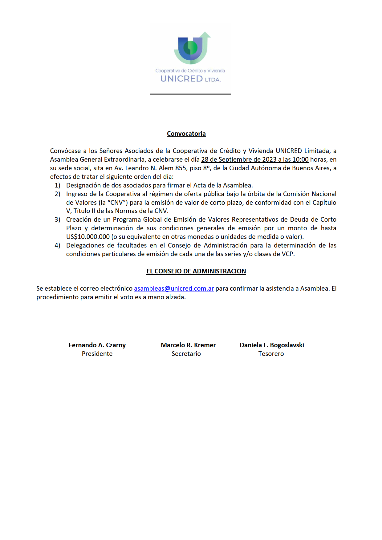 Convocamos a la Asamblea General Extraordinaria el día Jueves 28 de Septiembre de 2023 a las 10:00 horas en modalidad presencial en la Av. Leandro N. Alem 855 piso 8, C.A.B.A., como se detalla a continuación en el documento: